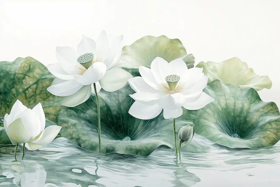 Fotobehang Groep witte bloemen en groene bladeren in water