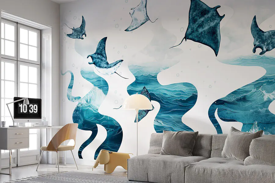 Verander elke ruimte in een serene onderzeese ontsnapping met de muurschildering "Groep pijlstaartroggen in het water". Dit betoverende kunstwerk toont sierlijke pijlstaartroggen die door dromerig blauw water glijden. Het is net een mini-onderwatervakantie zonder dat je ooit een tas hoeft in te pakken. Stel je voor dat je wakker wordt met deze rustige scène, de zachte golven die verhalen over de oceaan fluisteren. Of je nu een woonkamer opfleurt of een knus hoekje een vleugje charme geeft, deze muurschildering hult je muren in een rustgevende omhelzing. Met elke blik voel je je een beetje meer ontspannen, alsof je in vredig water drijft. En hoe cool zou het zijn om vrienden te vertellen dat je thuis een heiligdom voor pijlstaartroggen hebt? Het is perfect voor mensen die een vleugje natuur in hun leven willen inlassen, zonder dat ze een aquarium hoeven te onderhouden. Duik erin!