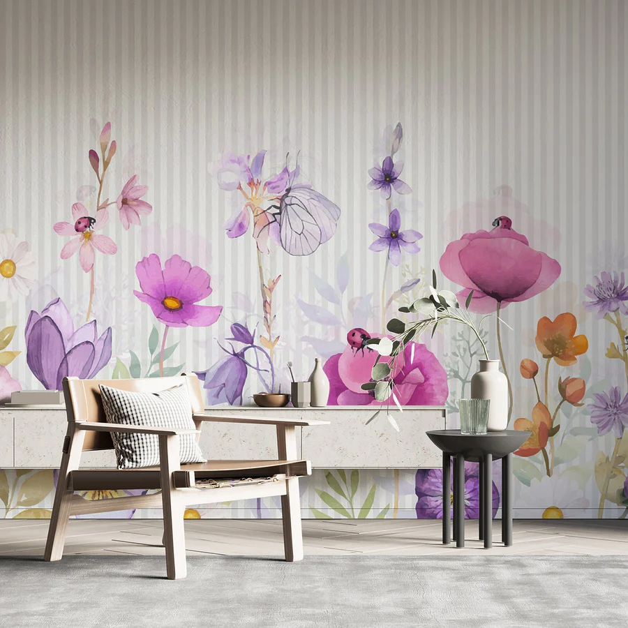 Fotobehang Kleurrijke bloemen en levendige insecten