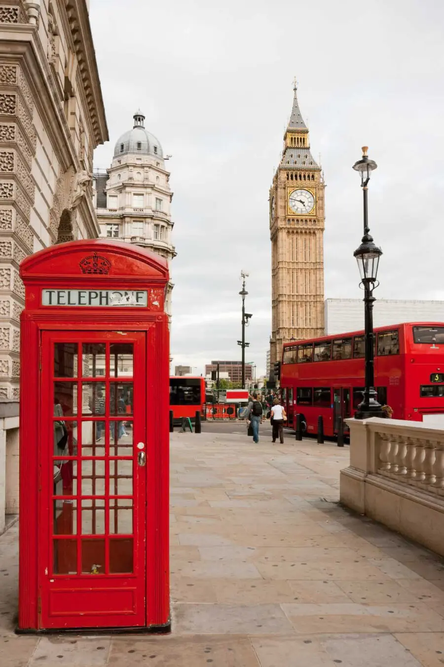 15.51 €9.30 €Fotobehang Rode dubbeldekkerbus op een straat met een klokkentoren op de achtergrond