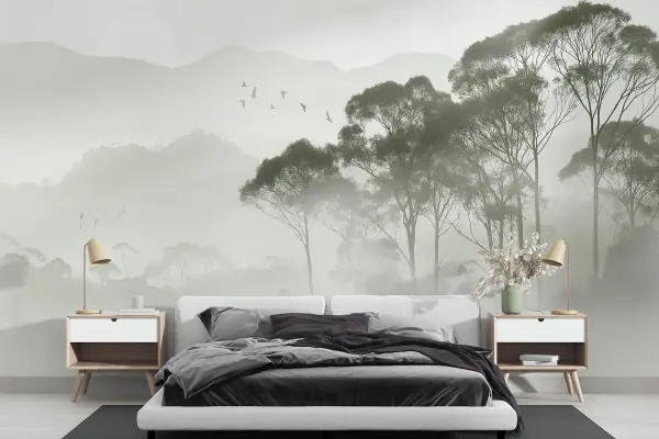 16.31 €9.79 €Fotobehang Bos met mist en wolken