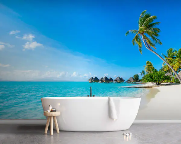 16.31 €9.79 €Fotobehang Strand met palmbomen en hutjes