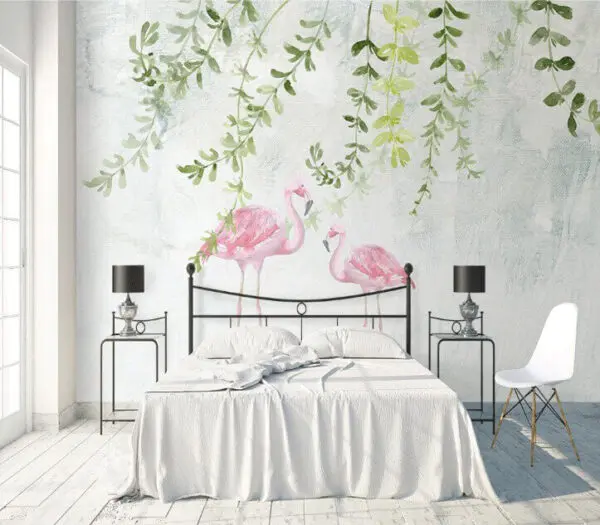 15.51 €9.30 €Fotobehang Twee roze flamingo’s met groene bladeren