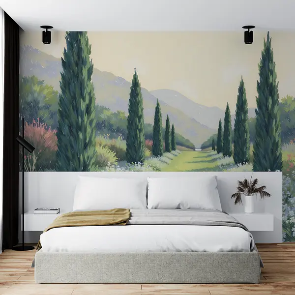 16.31 €9.79 €Fotobehang Schilderij van een landschap met bomen en bloemen