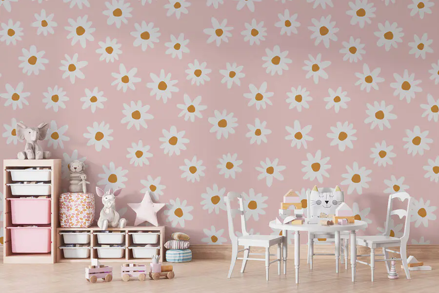 Fotobehang Een patroon van witte bloemen op een roze achtergrond