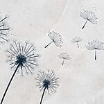 Fotobehang Groep paardenbloemen vliegend in de lucht