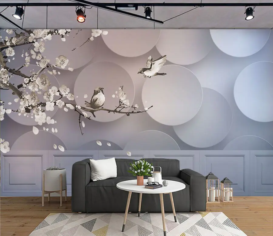 Fotobehang Muurschildering van vogels op een tak met witte cirkels en witte cirkels