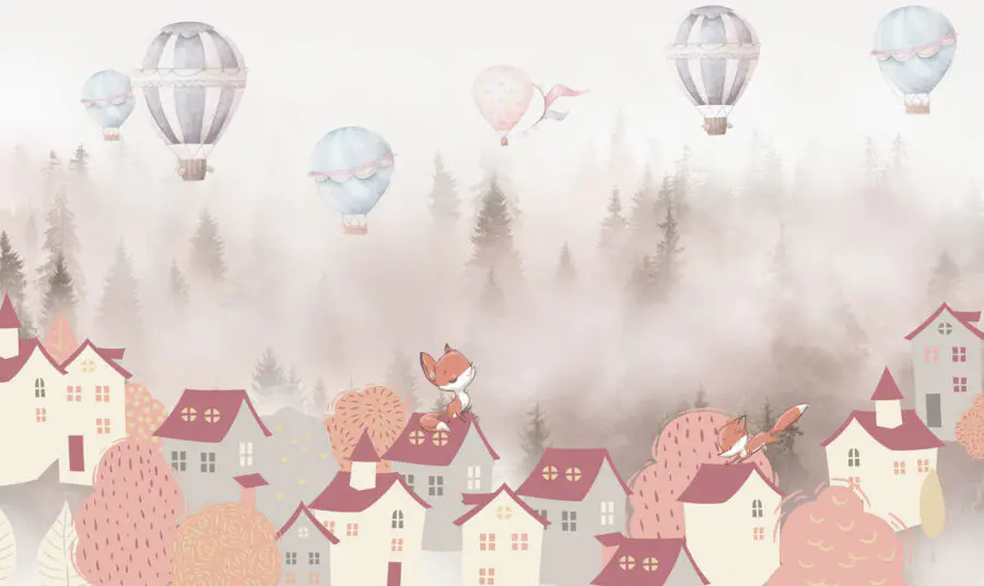 Fotobehang Spotprent van een vos op een dak van een stad met heteluchtballonnen