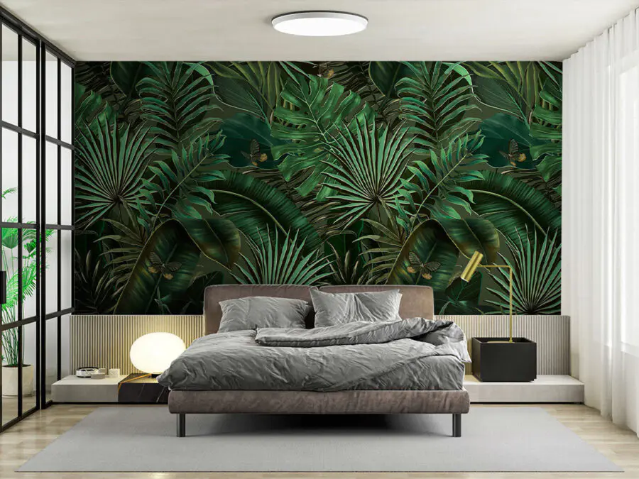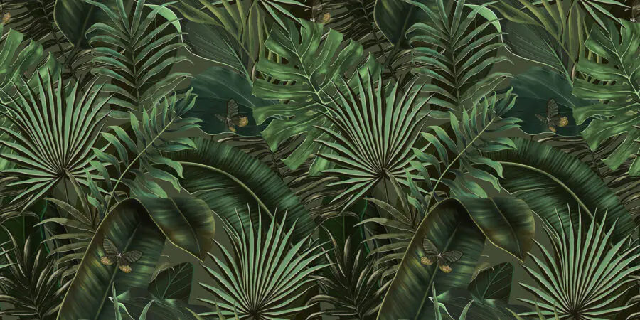 Fotobehang Weelderige groene bladeren en verborgen vlinders