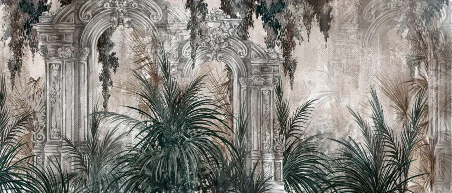Fotobehang Schilderij van een stenen boog met planten