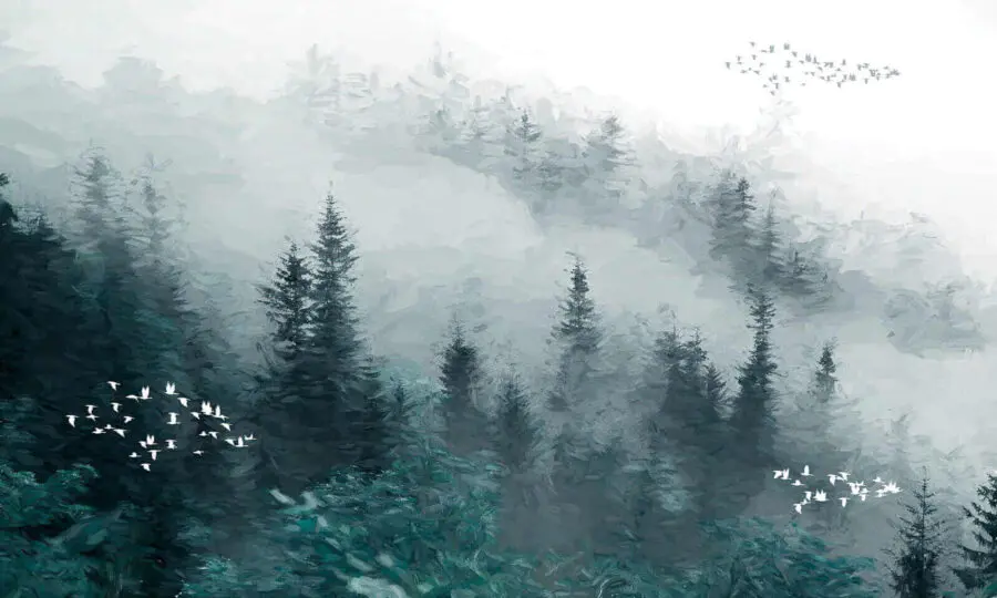 Fotobehang Wall murals Foggy forest with birds flying