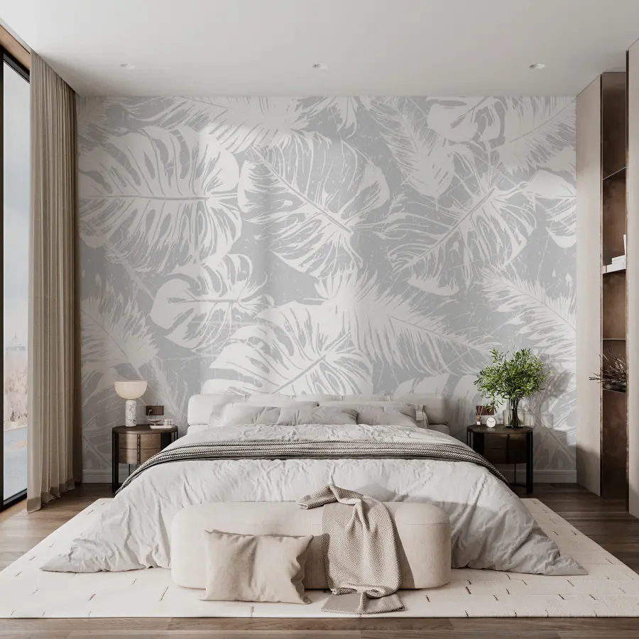 15.51 €9.30 €Fotobehang Witte bladeren op een grijze achtergrond