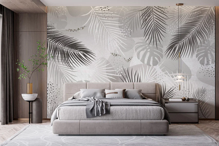 Fotobehang Grijze en witte achtergrond met bladeren