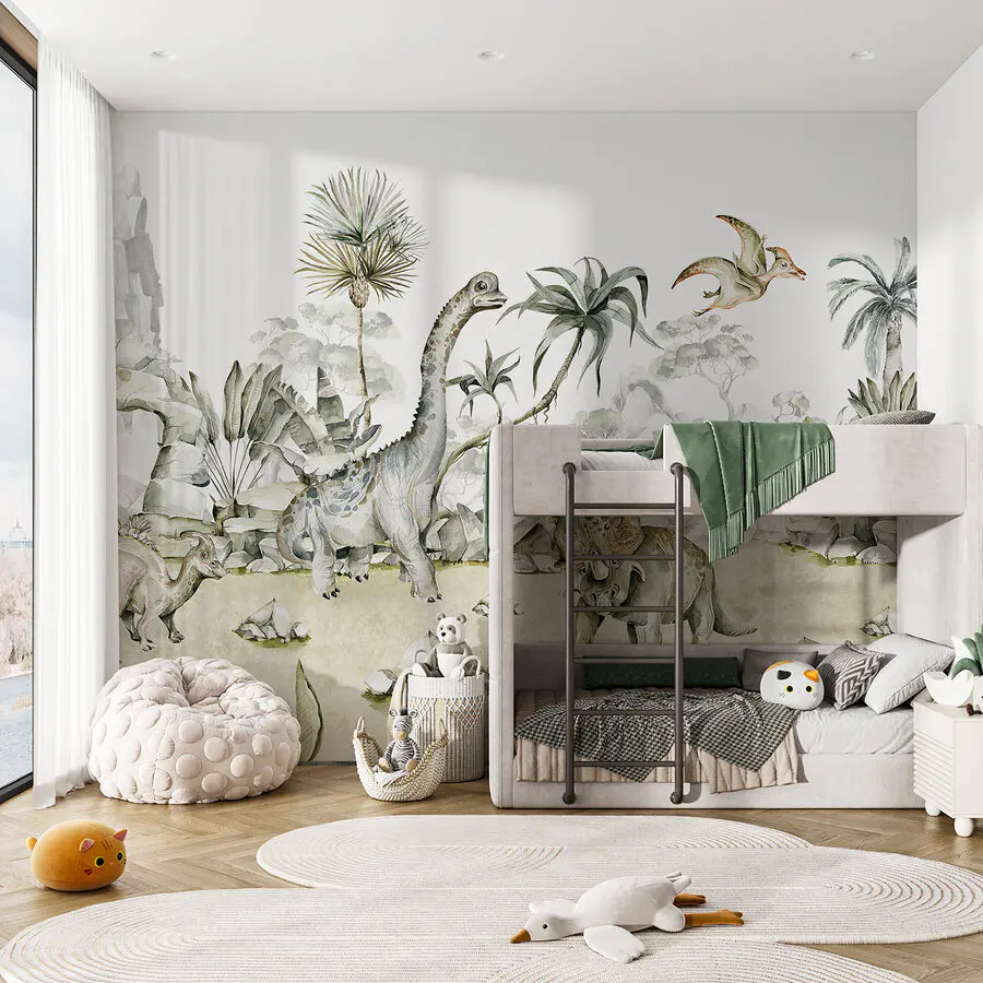 Fotobehang Aquarel van dinosaurussen en planten