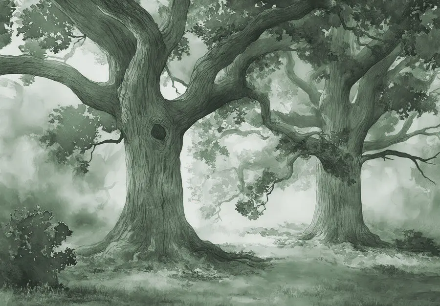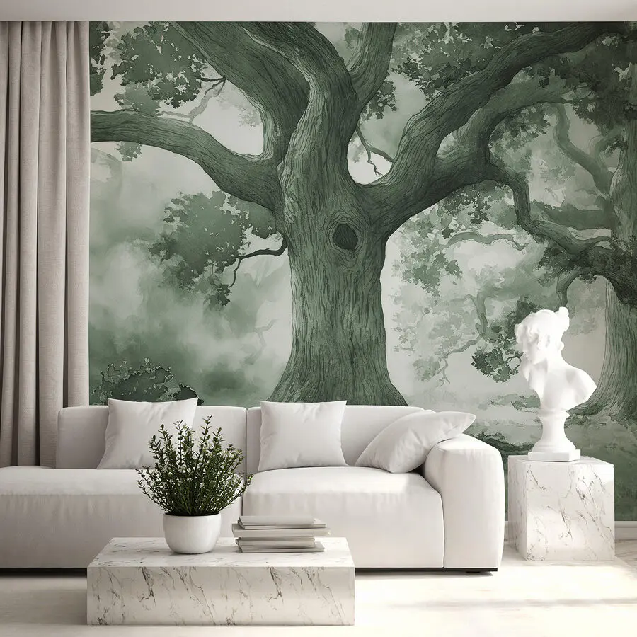Fotobehang Een groep bomen in een mistig bos