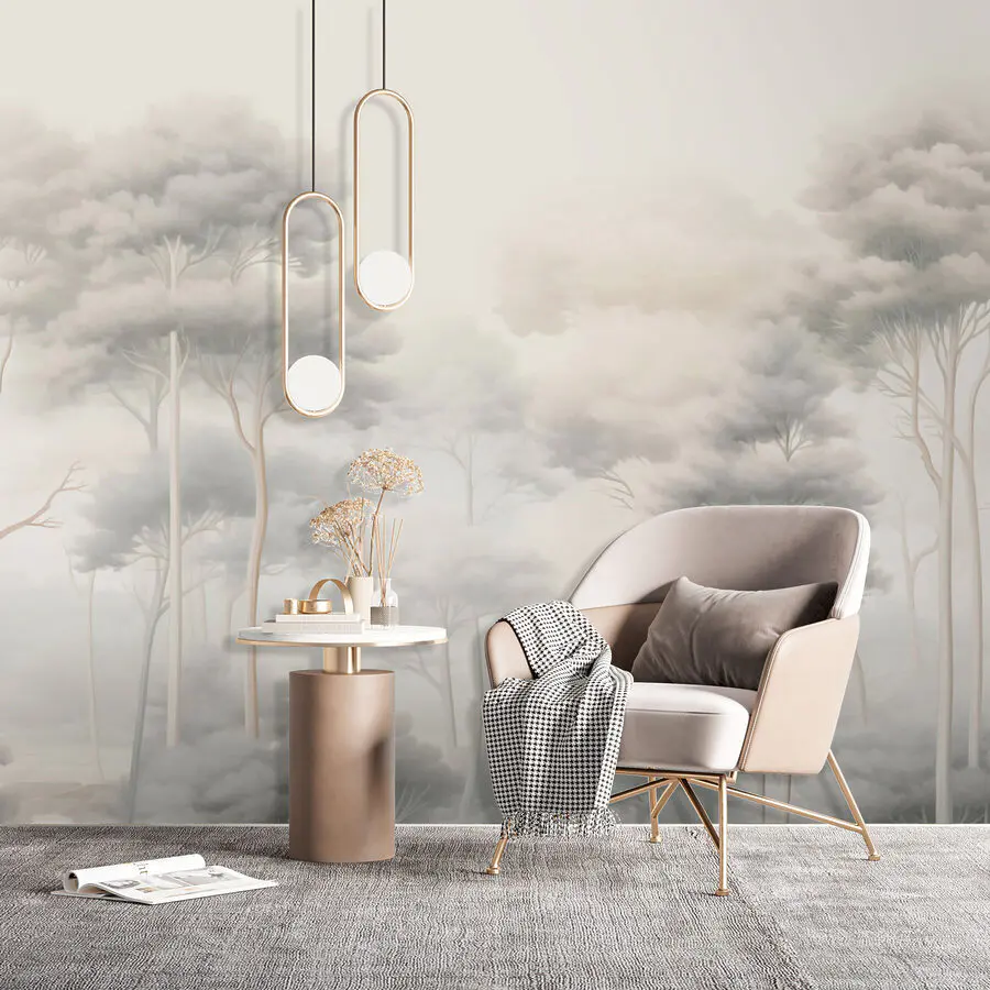 16.08 €8.85 €Fotobehang Aquarel van bomen en vogels vliegend over een mistig bos