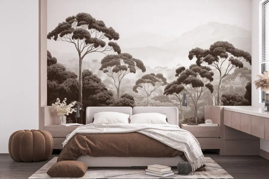 Fotobehang Bos met bomen en bergen op de achtergrond