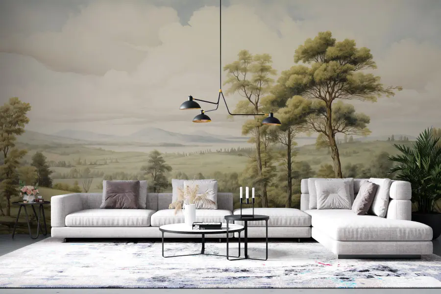 Stel je voor dat je een zonovergoten bos binnenstapt telkens als je je kamer binnenstapt. Deze betoverende muurschildering "Landschap met bomen en heuvels" brengt moeiteloos de schoonheid van de natuur binnenshuis. Het zachte groen en de rustige heuvels zijn als een knuffel van Moeder Natuur. Het is de perfecte achtergrond voor je ochtendkoffie of een gezellig samenzijn met vrienden. Stel je een regenachtige dag voor en hier is deze muurschildering, die je geest opfleurt met levendigheid. Bovendien is het een fantastische gespreksstarter - wie zou er niet naar dat prachtige uitzicht vragen? Verander je ruimte in een vredig toevluchtsoord en laat de schoonheid van de natuur je ziel kalmeren. Kijk alleen uit voor de denkbeeldige eekhoorns!