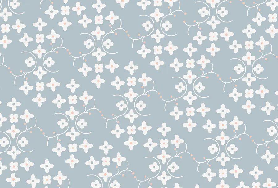 Fotobehang Patroon van witte bloemen en roze stippen op een blauwe achtergrond
