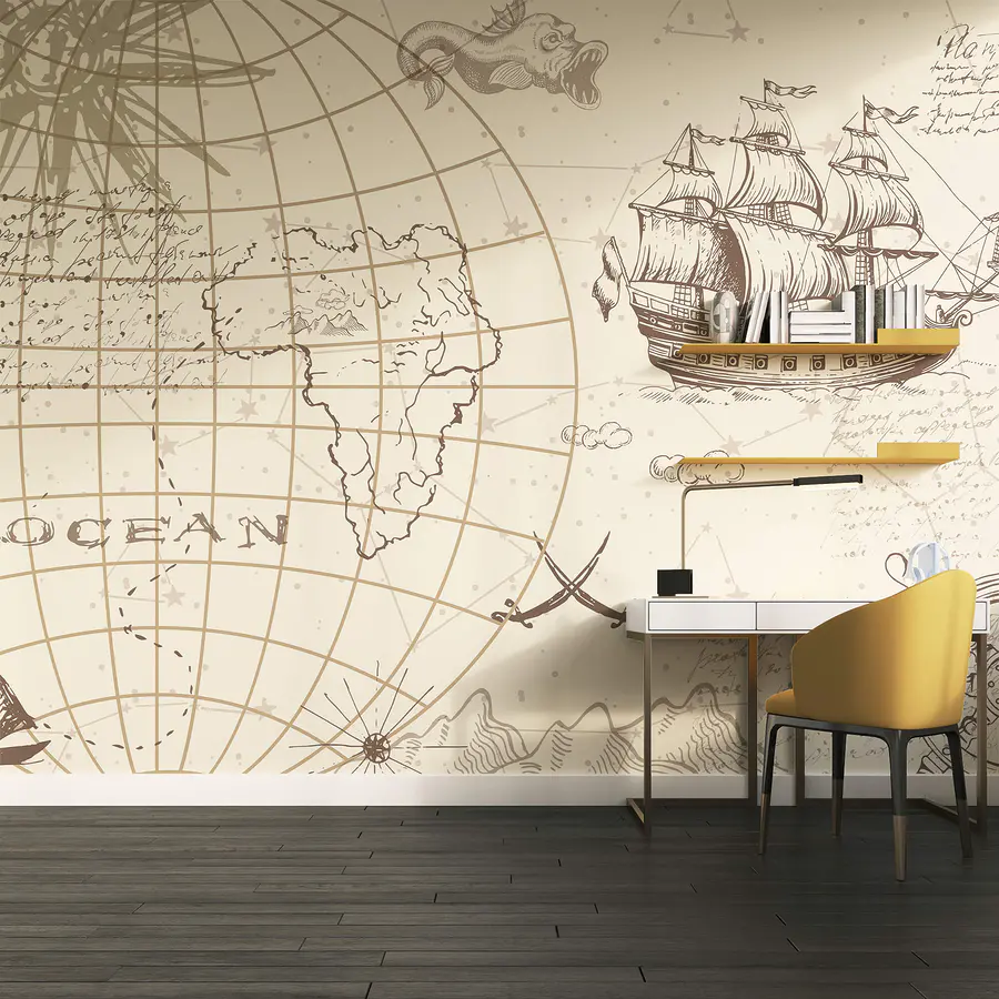 Fotobehang Kaart van de wereld en een schip