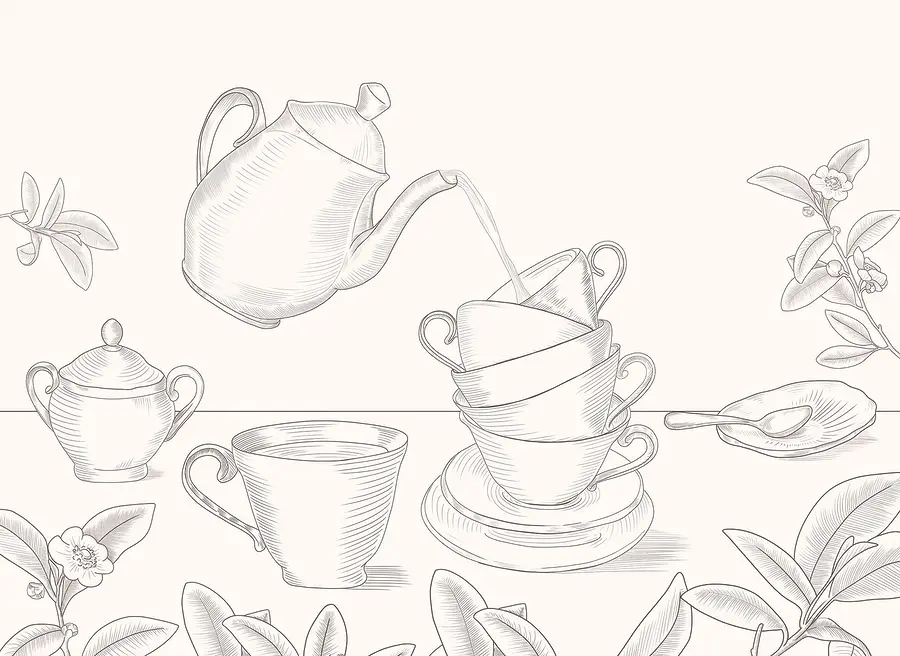 Fotobehang Theepot die in een stapel theekopjes schenkt