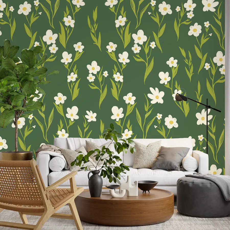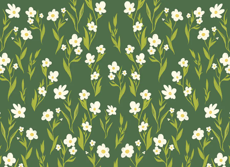 Fotobehang Patroon van witte bloemen en groene bladeren