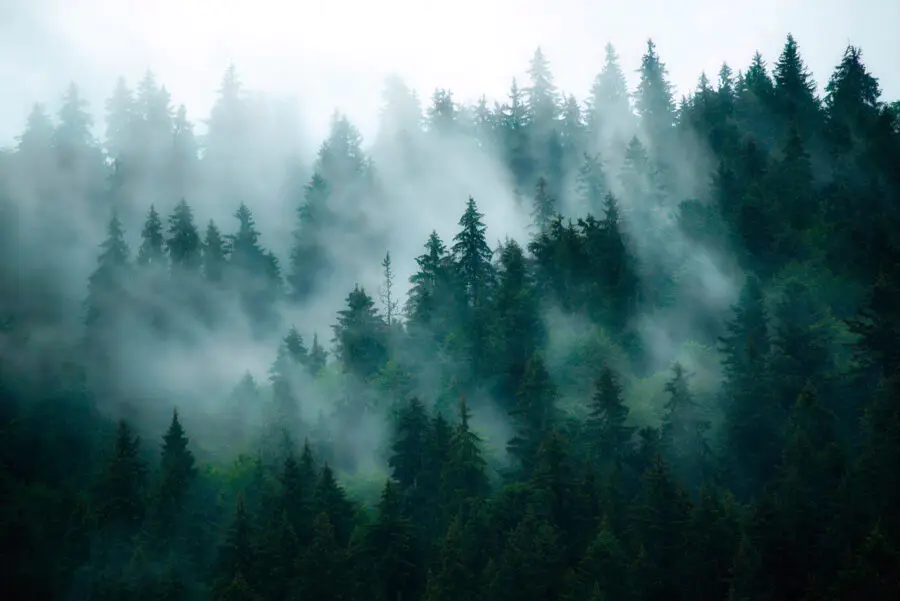 16.08 €8.85 €Fotobehang Bos met mist en bergen