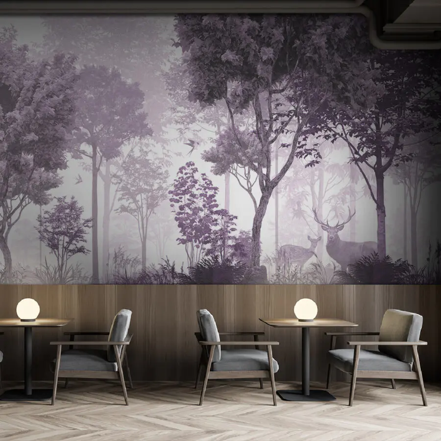 Fotobehang Een paarse en witte afbeelding van bomen en planten