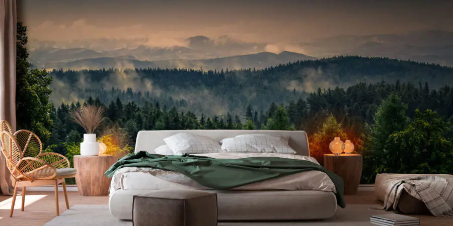 16.31 €9.79 €Fotobehang Bos met mist en bergen