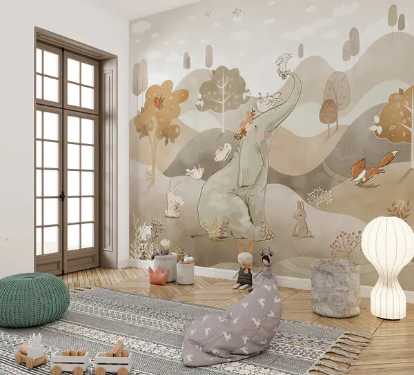 16.92 €9.30 €Fotobehang Een olifant en konijnen in een landschap