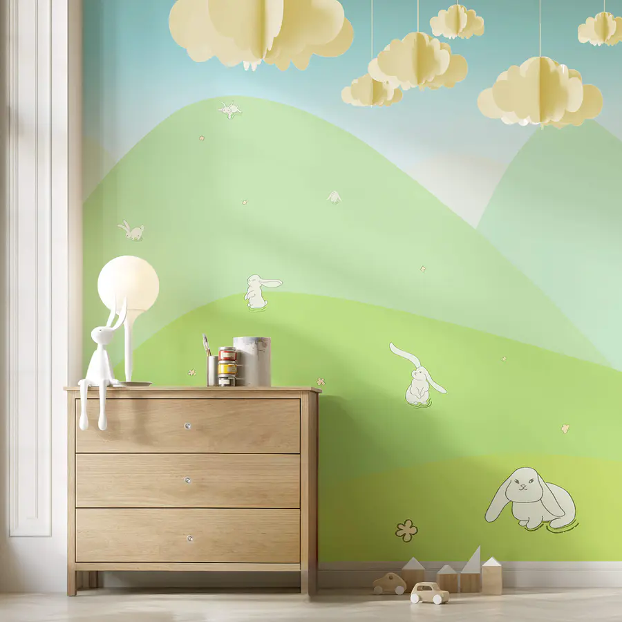 Fotobehang Spotprent van konijntjes op een groene heuvel