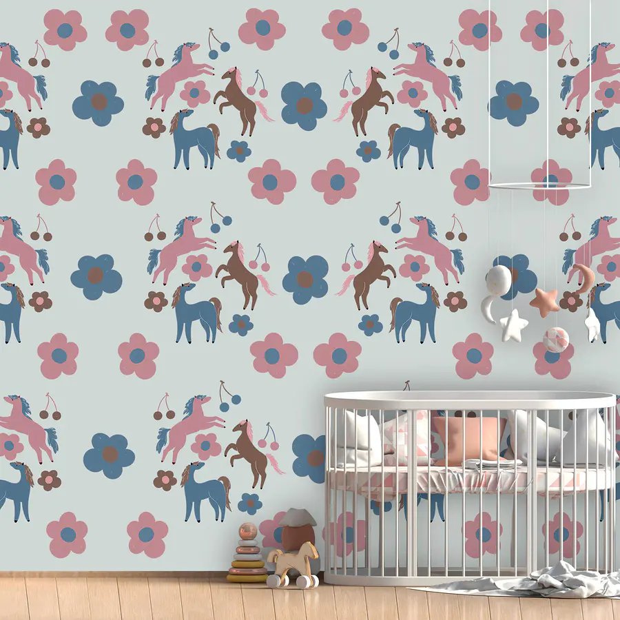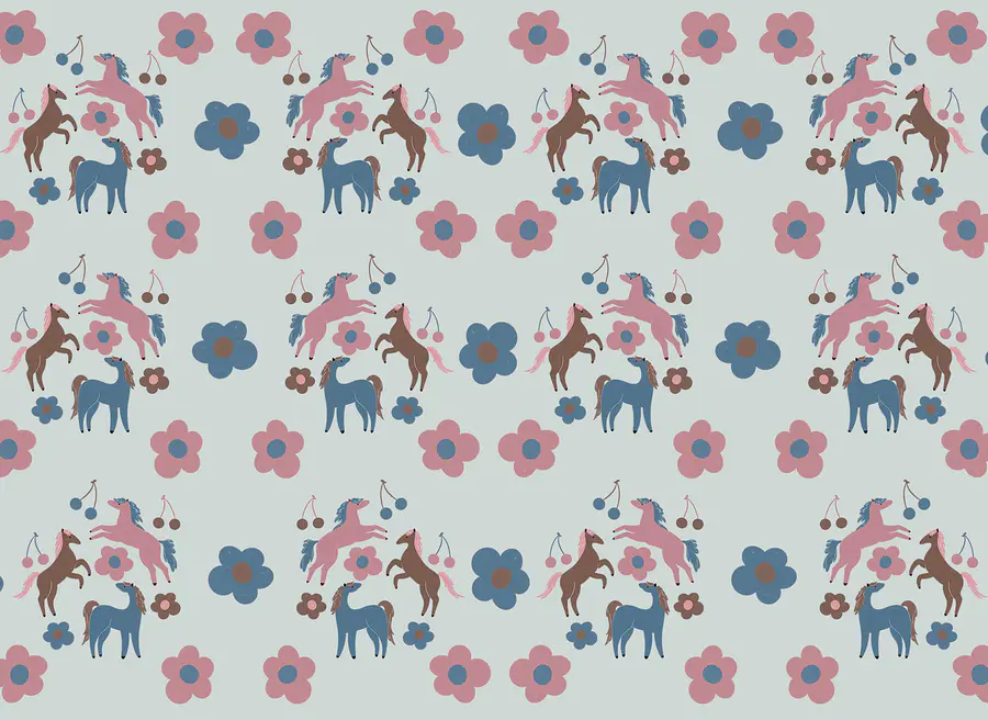 Fotobehang Patroon van paarden en bloemen