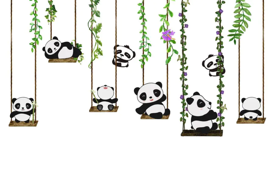 Fotobehang Groep panda’s op schommels