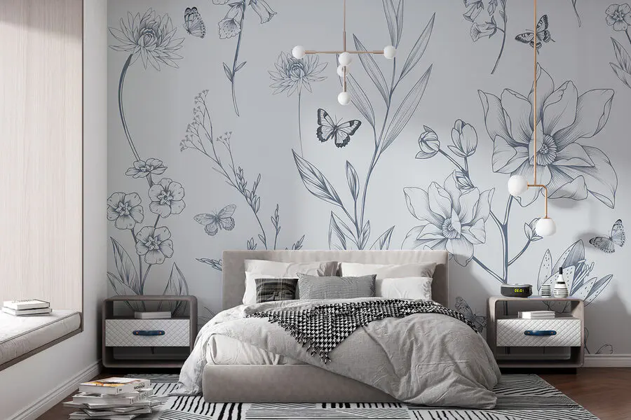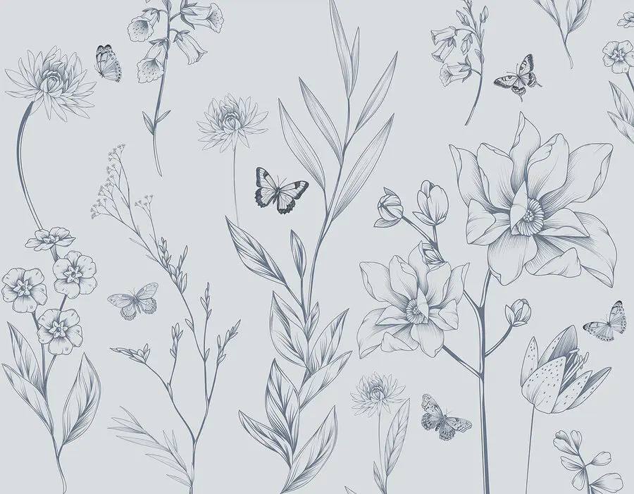 Fotobehang Tekening van bloemen en vlinders