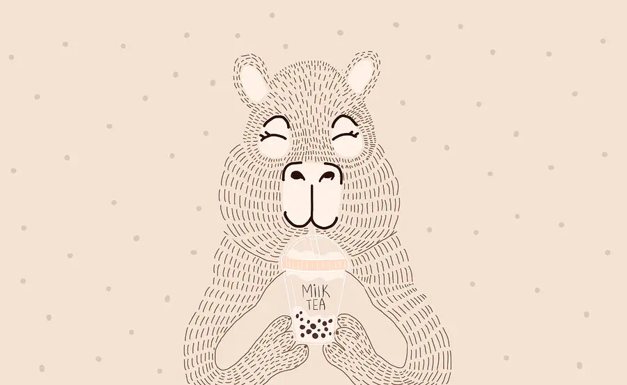 Fotobehang Beeldverhaal van een beer met een bubble tea