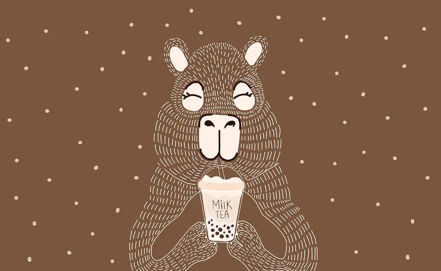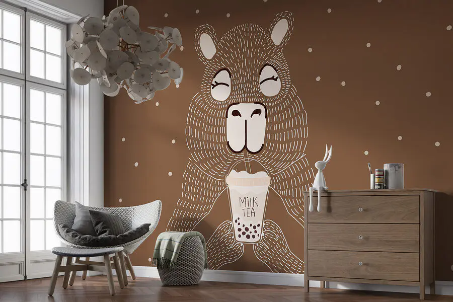 Fotobehang Beeldverhaal dier dat een kopje melkthee vasthoudt