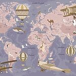 Fotobehang Een wereldkaart met vliegtuigen en heteluchtballonnen