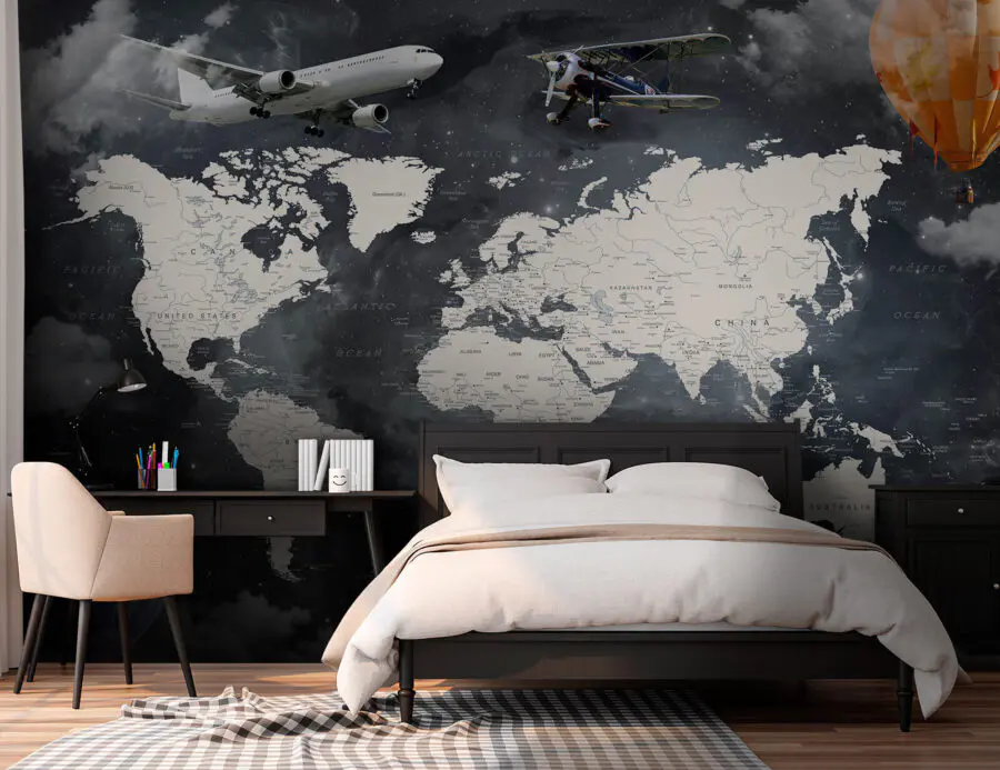 Fotobehang Wereldkaart met vliegtuigen en heteluchtballonnen