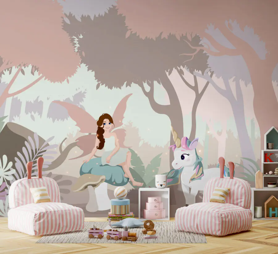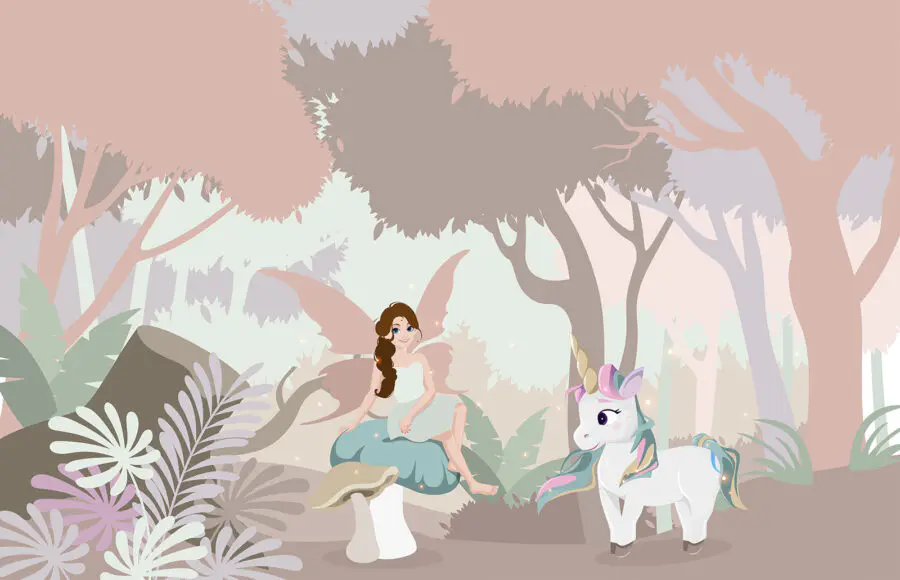 Fotobehang Cartoon van een vrouw zittend op een paddenstoel met een eenhoorn