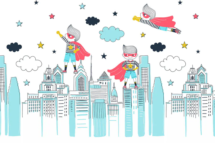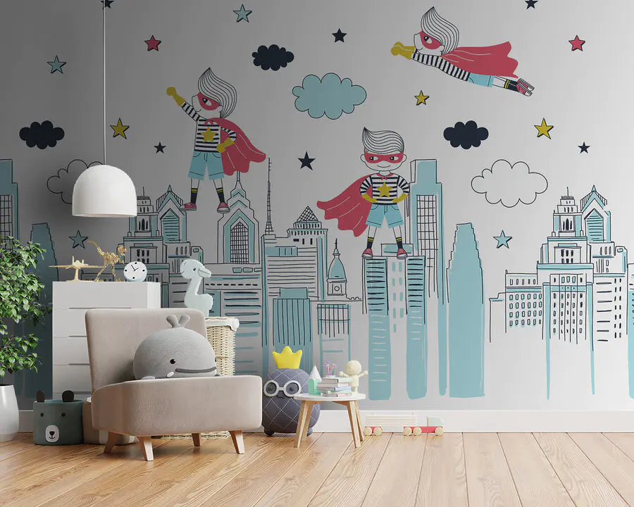 Fotobehang Een cartoon van een superheld op een stad