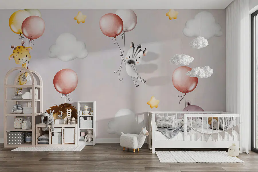 Fotobehang Behang met dieren en ballonnen