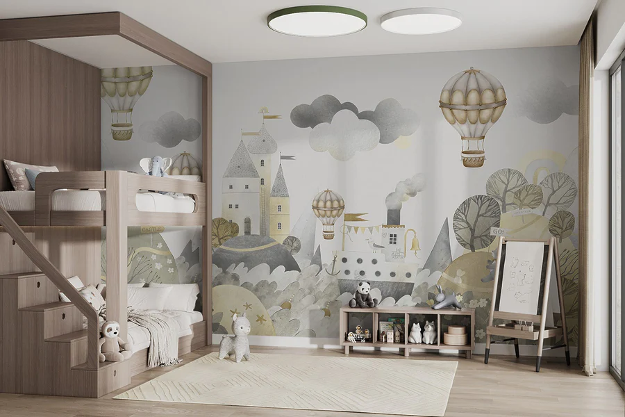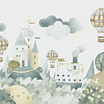 Fotobehang Aquarel van een kasteel en heteluchtballonnen