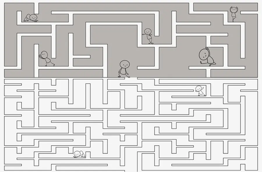 Fotobehang Doolhofspel met cartoonfiguren die op de grond lopen