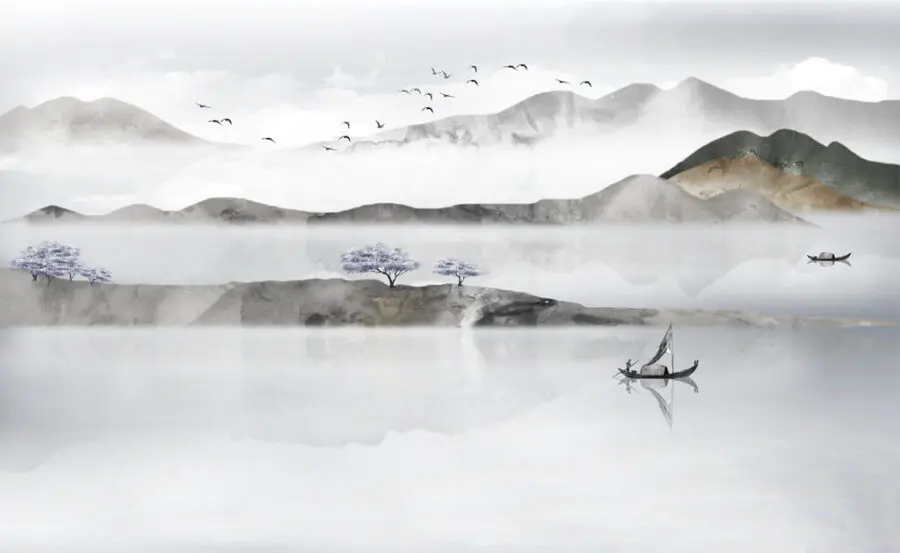 15.51 €9.30 €Fotobehang Boot in het water met vliegende vogels in de lucht