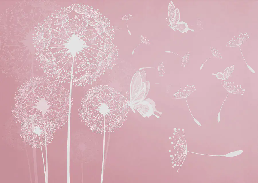Fotobehang Een roze achtergrond met witte paardenbloemen en vlinders