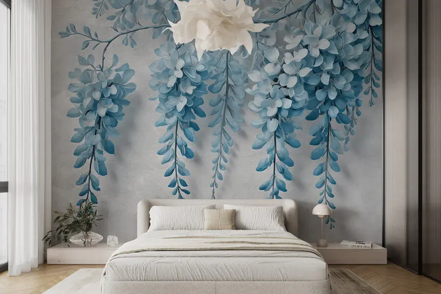 Fotobehang Tak met blauwe bloemen