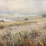 Fotobehang Schilderij van een veld met bloemen en een meer