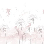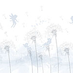 Fotobehang Een paardenbloem met elfjes die door de lucht vliegen