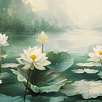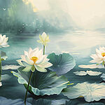 Fotobehang Schilderij van witte bloemen en bladeren in een meer