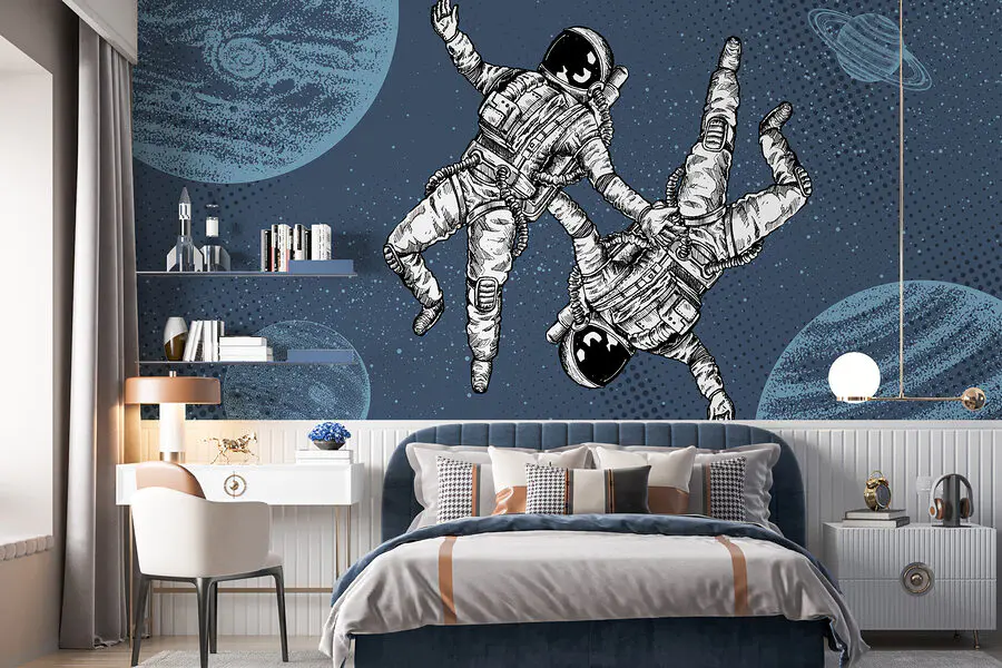 Maak een reis naar het heelal met deze muurschildering van twee astronauten die sierlijk door de ruimte zweven. Het is alsof je een interstellair avontuur in je kamer hebt - wie zou dat niet willen? De achtergrond van wervelende planeten en een uitgestrekte sterrenhemel zorgt voor een dromerige sfeer, perfect om de verbeelding aan te wakkeren. Of het nu een kinderkamer is of een speelse hangplek voor volwassenen, deze muurschildering brengt de ontdekkingsreiziger in iedereen naar boven. Stel je voor hoe de kleintjes naar boven staren, dromend van hun eigen ruimtemissies. Het is een heerlijke manier om een vleugje verwondering en een beetje eigenzinnigheid toe te voegen aan elke ruimte. Dus ga je gang, laat je muren een verhaal vertellen dat echt buitenaards is!